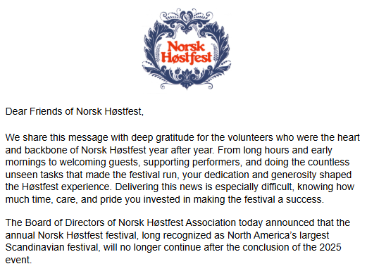 मैं यह सोचना चाहता हूं कि होस्टफेस्ट को किसी नई चीज़ से बदल दिया जाएगा जो हमारे क्षेत्र में स्कैंडिनेवियाई विरासत को संरक्षित करना जारी रखेगी, लेकिन शायद ऐसा नहीं होगा। स्पष्ट होने के लिए, कुछ संरक्षण जारी है। स्कैंडिनेवियाई हेरिटेज एसोसिएशन, जो मिनोट में स्कैंडिनेवियाई हेरिटेज पार्क का रखरखाव करता है, सहन करेगा, और यह एक अच्छी बात है। वे अद्भुत काम करते हैं.